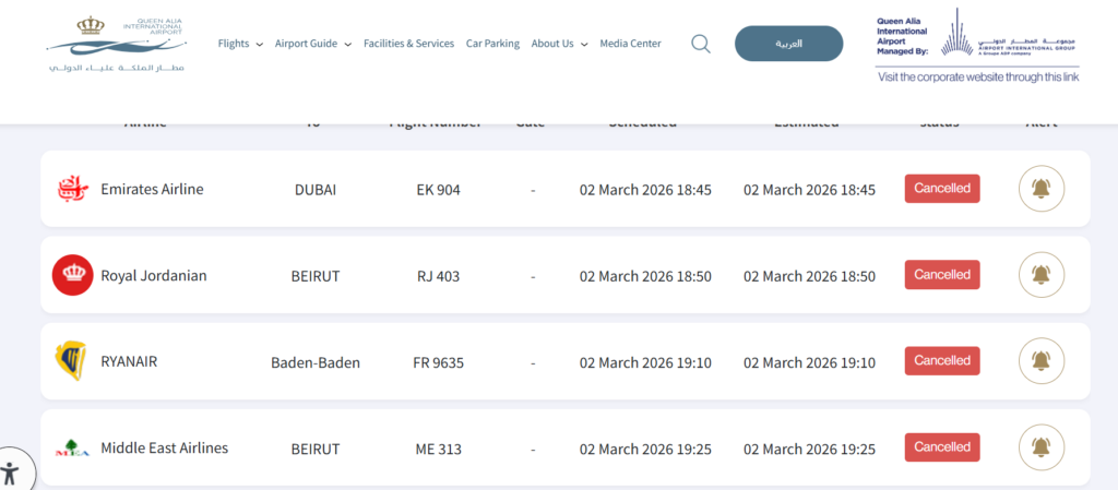 アンマンにあるクイーンアリア国際空港はまだ封鎖されていませんが、フライトキャンセルのオンパレード。出発便を確かめてみたことろ、2026年3月2日現在はサウジアラビア、イラク、ナイジェリア、トルコの主要都市には行けるようです。イスタンブールまで行けば、そこから東京まで行く手段は無きにしも非ず。ですが、完全自腹&自己責任です!!!
