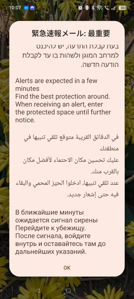 これを書いている今まさに、【緊急速報メール(数分以内に警報が鳴るという警告)】が来ました。なんともエキサイティングなサバイバル生活ですが、非常にユニークな体験をしているというこで!日々過ごしていきたいと思います。