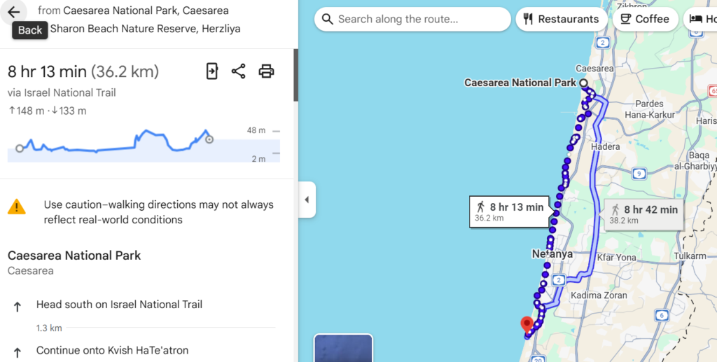 たとえばシャロンビーチからは、カイザリア公園(Caesarea National Park)までもナショナル・トレイルをたどれば8時間でたどり着くことができます。(私はやりませんが!)