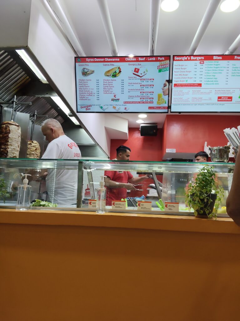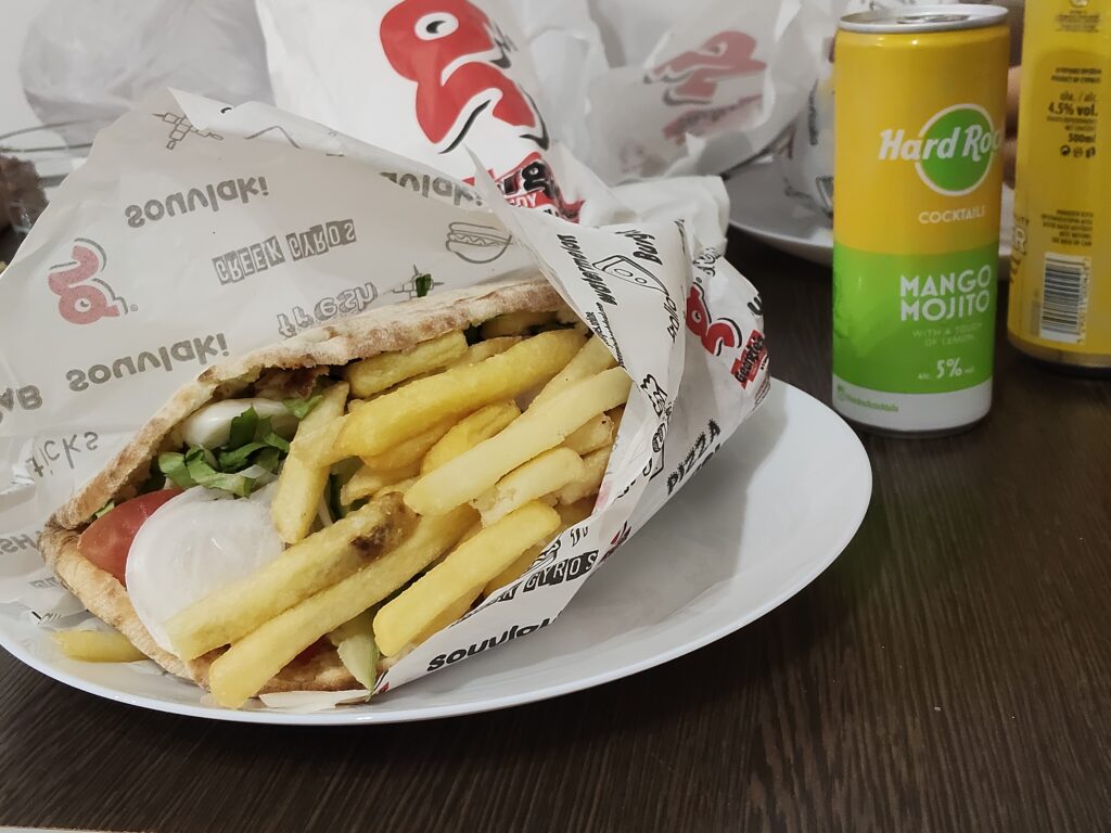 ギロス(gyros、回転焼きをした肉を薄くそぎ落として食べる)をピタやラップサンドにして販売している、まさに「手で持って食べらるファーストフード」のお店。テイクアウェイして食べるもよし、店頭で食べるもよし。一人一つずつ頼んだら、とんでもないボリュームでした…!