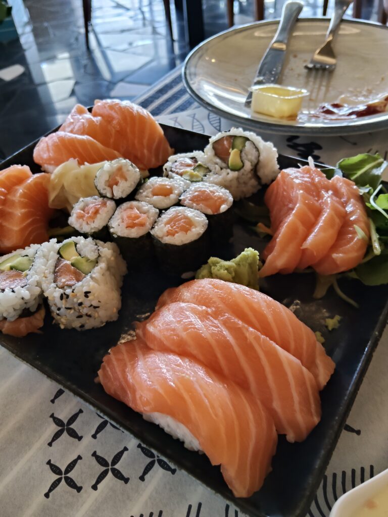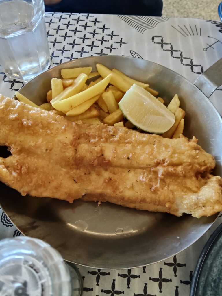 有名なフィッシュアンドチップス、そしてサーモンの寿司プラッター(盛り合わせ)を注文!
