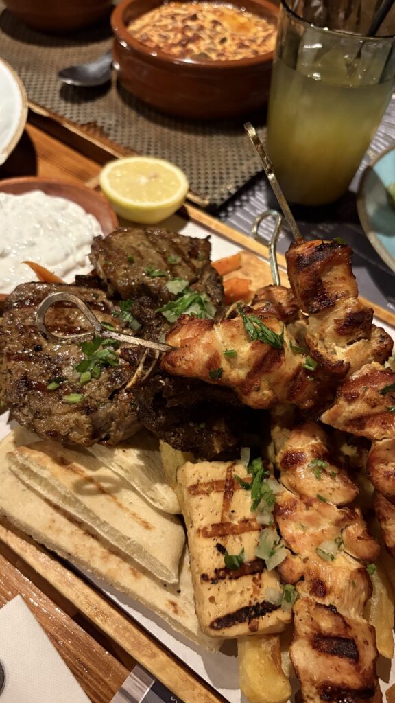 肉の盛り合わせには、キプロス名物のハルーミ(チーズ)の串焼きもありました。焼いても溶けない不思議なチーズ!山羊乳&羊乳から作られています。